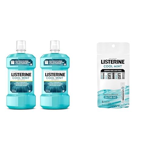 Listerine Cool Mint Mouthwash, Kills 99.9% of Germs That Cause Bad Breath, 1L Bottle 2 Pack + Listerine Cool Mint Alcohol Free Mouthwash Packets Mini Travel Size, 0.33 fl oz. Pack of 5